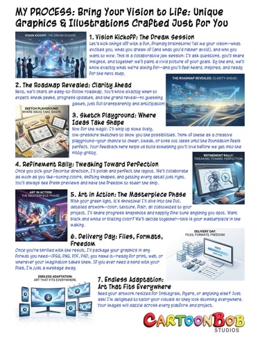 My cartoons, graphs, banners, and serious illustrations are unique. Visuals are a KEY and memorable way to convey and sell the ideas and products showcased on your website. AI is effective, but it can be easily recognized, yet lacks the charm and underlying thinking of Custom CartoonBob spot illustrations.