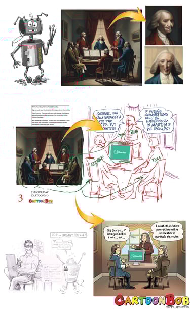 CartoonBob has been called upon to rectify the poor results produced by AI robot artists. At CartoonBob Studios, we expertly use our traditional drawing and layout skills honed over many years. The actual difference lies in our CREATIVE ART DIRECTION and REAL-LIFE HUMAN GRAPHICS EXPERIENCE!