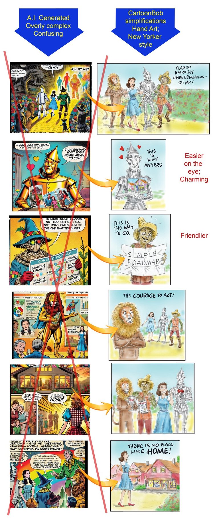 These 2 vertical before/after graphics show how I fixed an overly overdone AI comic strip based on the Wizard of Oz story. First the b/w art, and then color... just like in the movie.