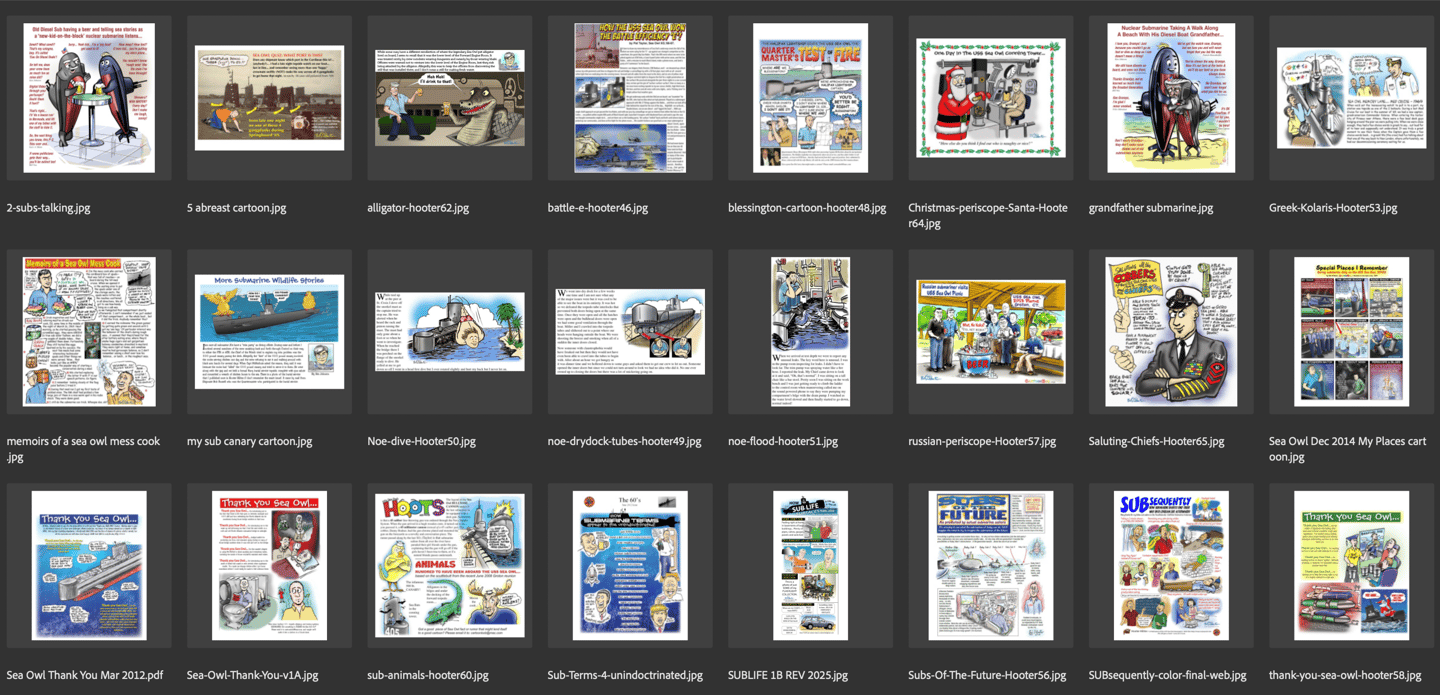 As a bubblehead (submarine sailor) as well as a cartoonist, I've done many cartoons related to subs. Feel free to email me chat about my navy time.