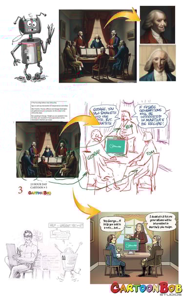 CartoonBob has been called upon to rectify the poor results produced by AI robot artists. At CartoonBob Studios, we expertly use our traditional drawing and layout skills honed over many years. The actual difference lies in our CREATIVE ART DIRECTION and REAL-LIFE HUMAN GRAPHICS EXPERIENCE!